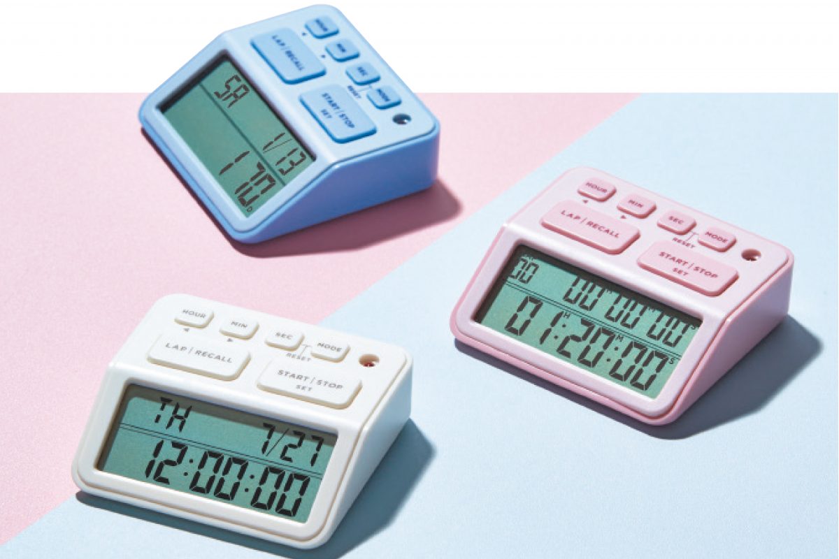 ラップタイムを残せるタイマー。設定時間から超過した時間を測れる「折り返しカウントアップ機能」を搭載し、ペース配分の見直しにも活躍。試験までの残日数を数える「デイカウントモード」もある。