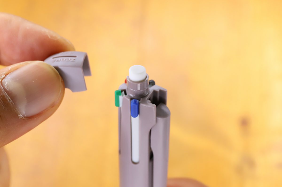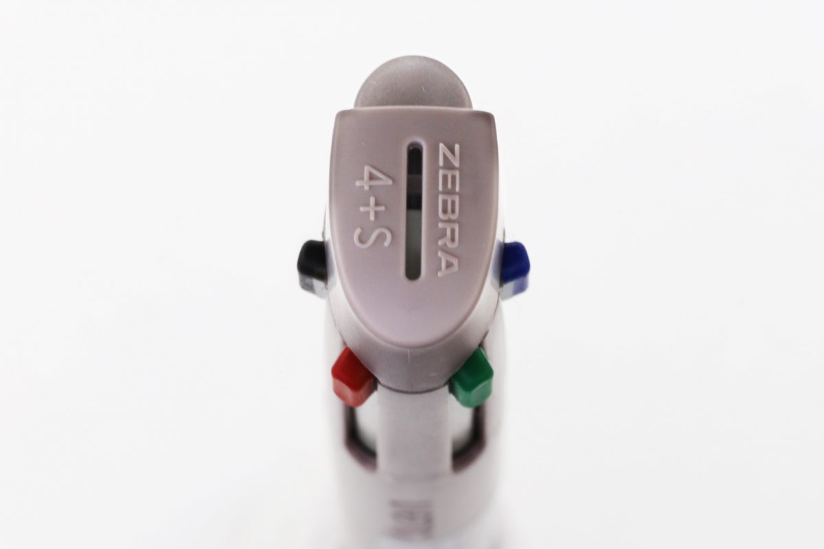 2024年2月末に発売されたゼブラ「ブレン4+S」は、冒頭でも述べたとおり、お馴染みブレンシリーズの最新ラインナップとなる多機能ペンだ。機能の配置は、まず長楕円になっている軸後端の円周に黒・赤・青・緑のエマルジョンインクのサイドノックが並び、楕円頂点にあるクリップがシャープのノックを兼用している。4+Sの構造として珍しいものではないが、もともと楕円をイメージしているブレンのフォルムからは大きく変えずに、各ノックを配置したデザインはなかなかに上手い。