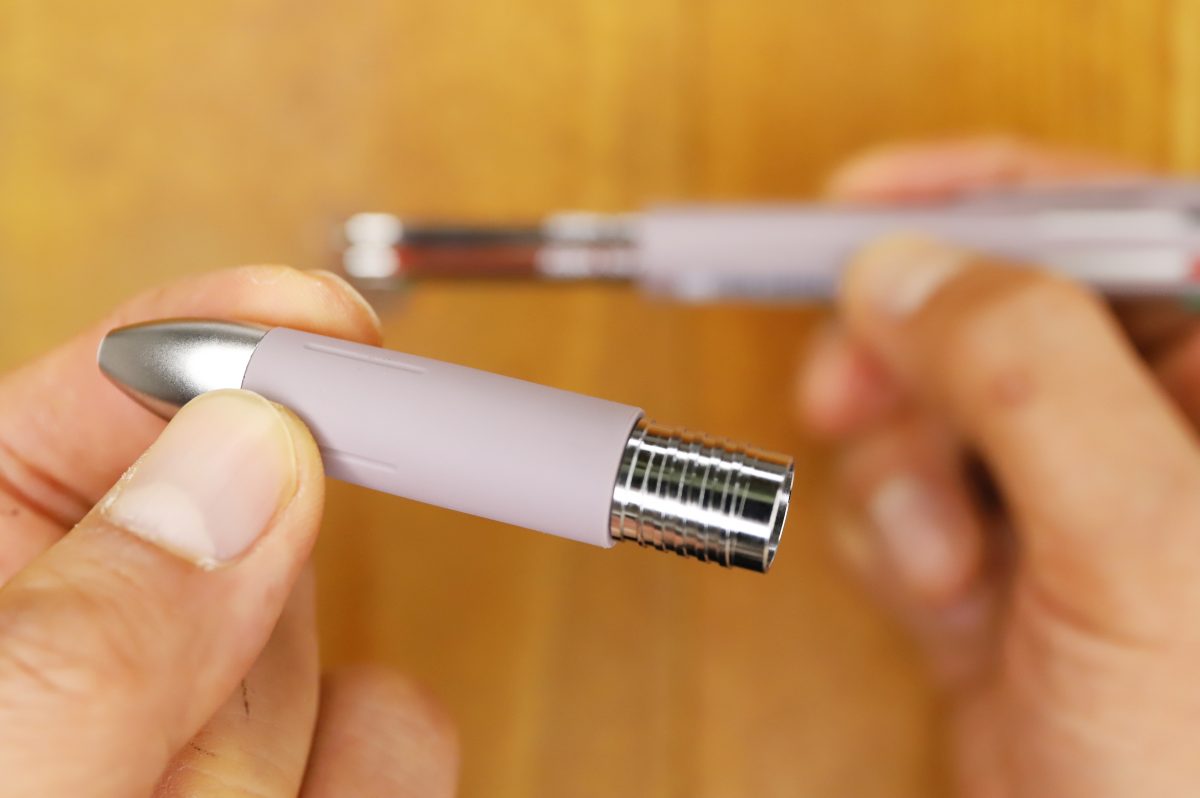 グリップは実測で直径約13.3mmと、かなり太軸。とはいえ、ブレン3Cと比べると、2機能も追加されたほどの太さは感じない(後端のサイズはかなり違うが)。これは、軸の板厚を強度が落ちないギリギリにまで薄くする、というスリム化の工夫の賜物のようだ。また、デザイン的に凹凸が少ないので、すっきりスリムに対する視覚的要素もあるだろう。