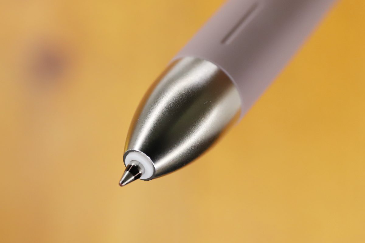 何より、ブレンらしさといえば、ペン先のカチャカチャとしたブレをどこまで抑えられているか、が重要なところ。多色/多機能ペンは、軸の内縁からペン先に向けてリフィルを突き出すという構造上、どうしても飛び出したペン先が傾くし、その分だけ口金の先端でブレが生じやすい……というか、ブレをゼロにするのはかなりの無理筋と言えるだろう。
