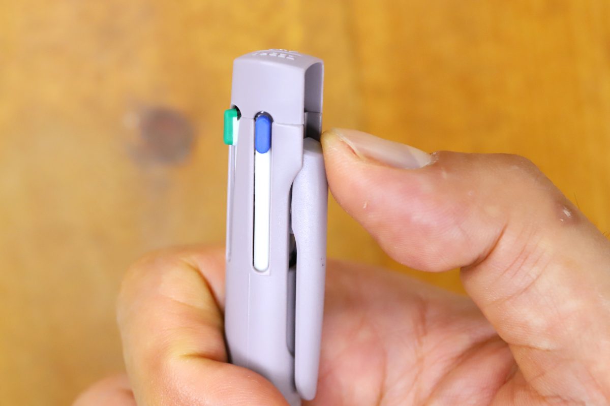 シャープペンシルを使う際は、クリップ部をグッと押し込んでペン先を出し、さらにそこからもう一段階の押し込みで芯出しノックとなる。ただし、多機能の構造上、どうしてもペン先を出した時点でクリップが少し軸側に引き込まれてしまうため、手がかりが減って、芯出しノックが少々やりにくいようには感じた。正直、これは慣れるか、自分なりに押しやすい方法を模索するしかないだろう。
