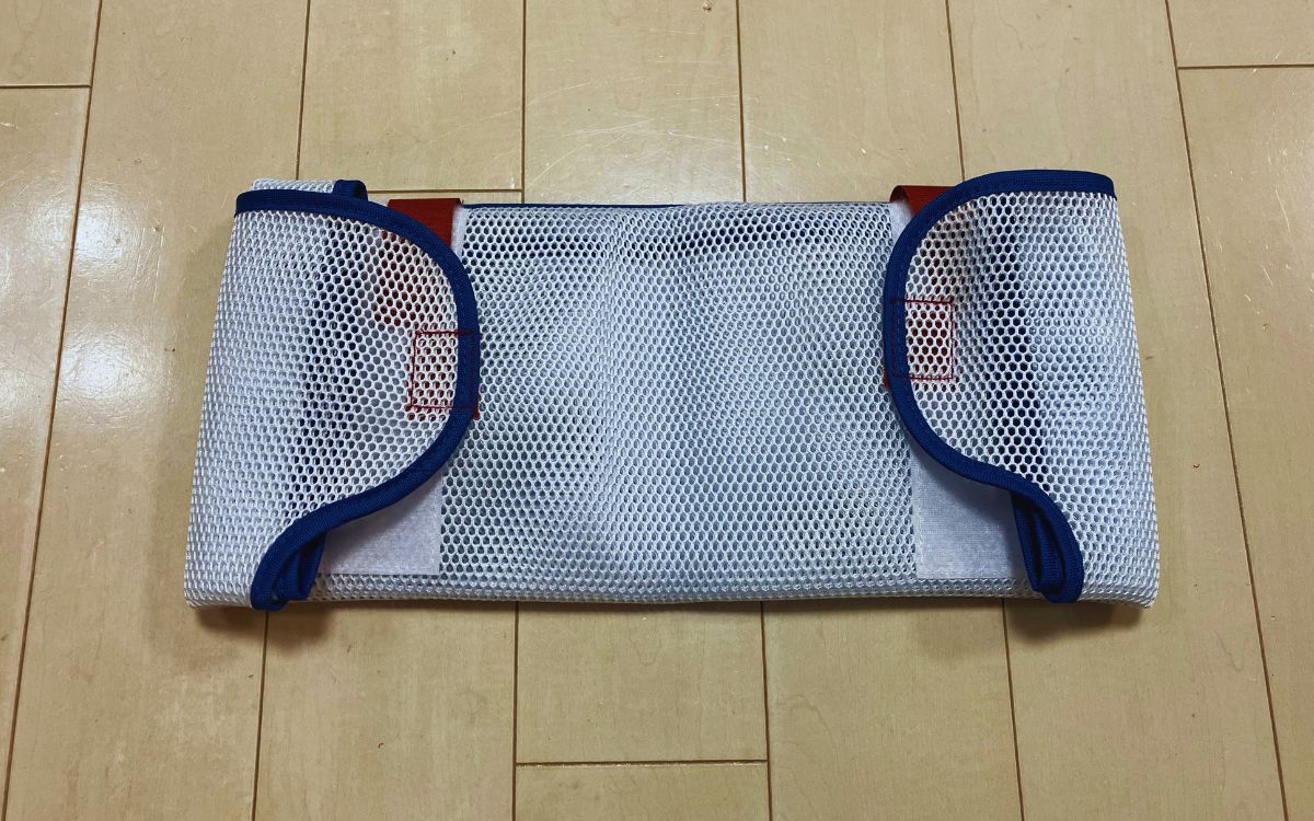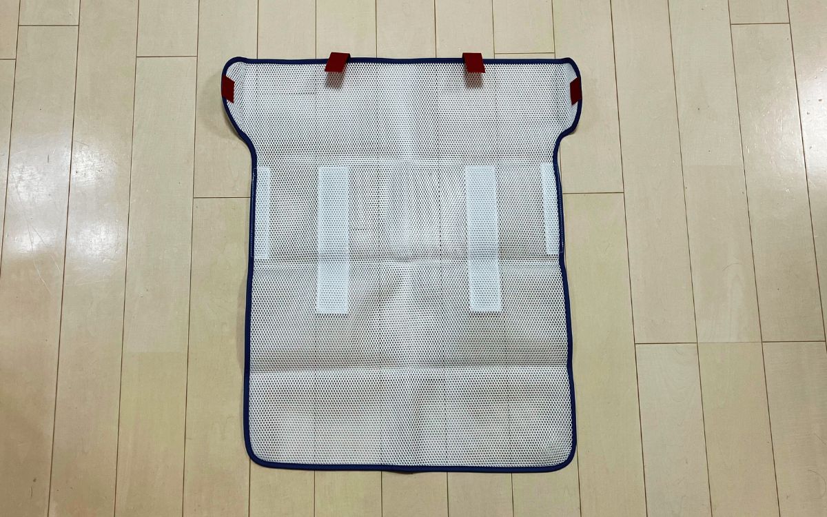 最初は約縦18cm×横27cm×厚み3cmのサイズに折りたたまれていました。マジックテープを外して広げると、およそ縦69cm×横65cmまで広がります。ネットは二重構造でクッション性があり、衣類を保護する効果が高そう。