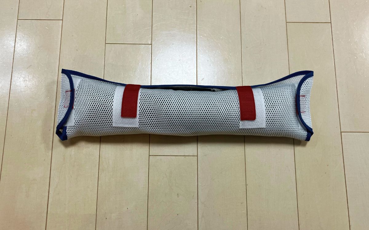 使い方は、洗濯したい衣類を広げたネットの中に置き、下からくるくる巻きあげてマジックテープで留めるだけ。一般的なレディースSサイズのニットを置いてみたところ、ネット内にしっかりと収まりました。腕部分のみ折りたためば身頃は折らずに巻くことができます。パンツなどのはみ出す衣類は事前に収まる大きさに畳んでセットすれば、最低限の折り目だけで洗濯できますよ。