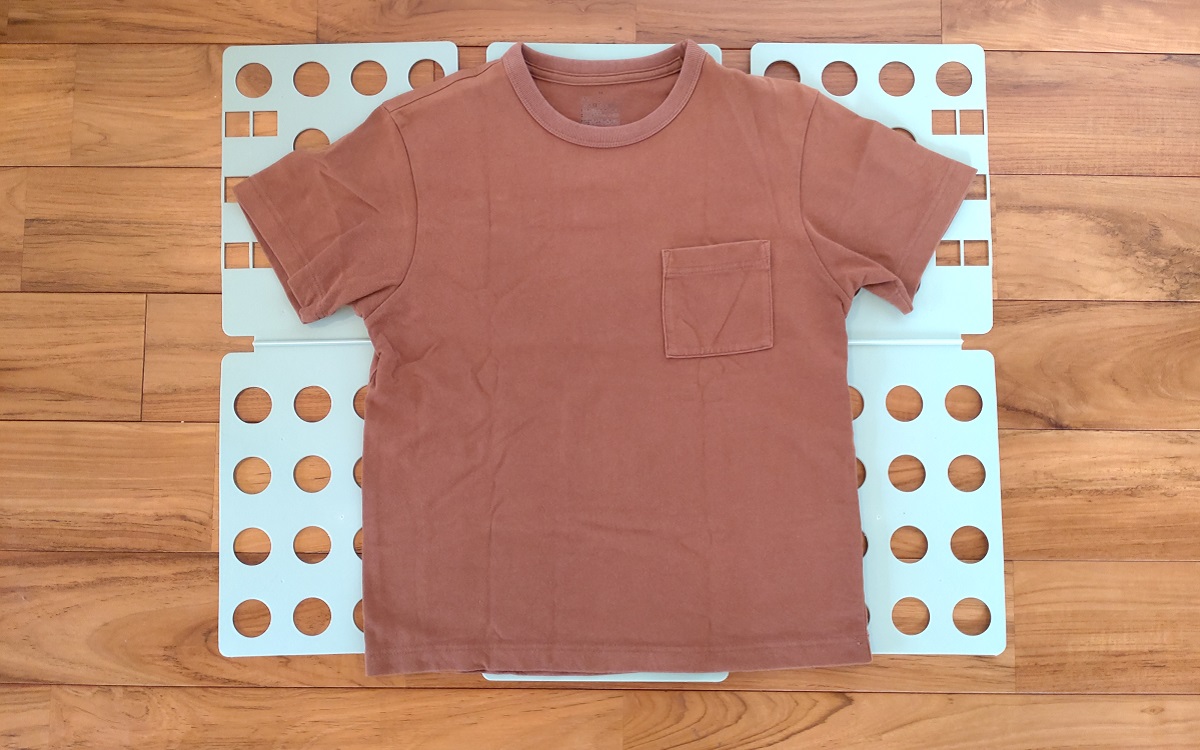 まずは本体の上にTシャツを広げて置きます。今回はTシャツの大きさがちょうど良かったのですが、大きいサイズの服を畳む際は、本体からはみ出た部分をあらかじめ内側へ追っておきましょう。そして片方の板を内側にパタリ。