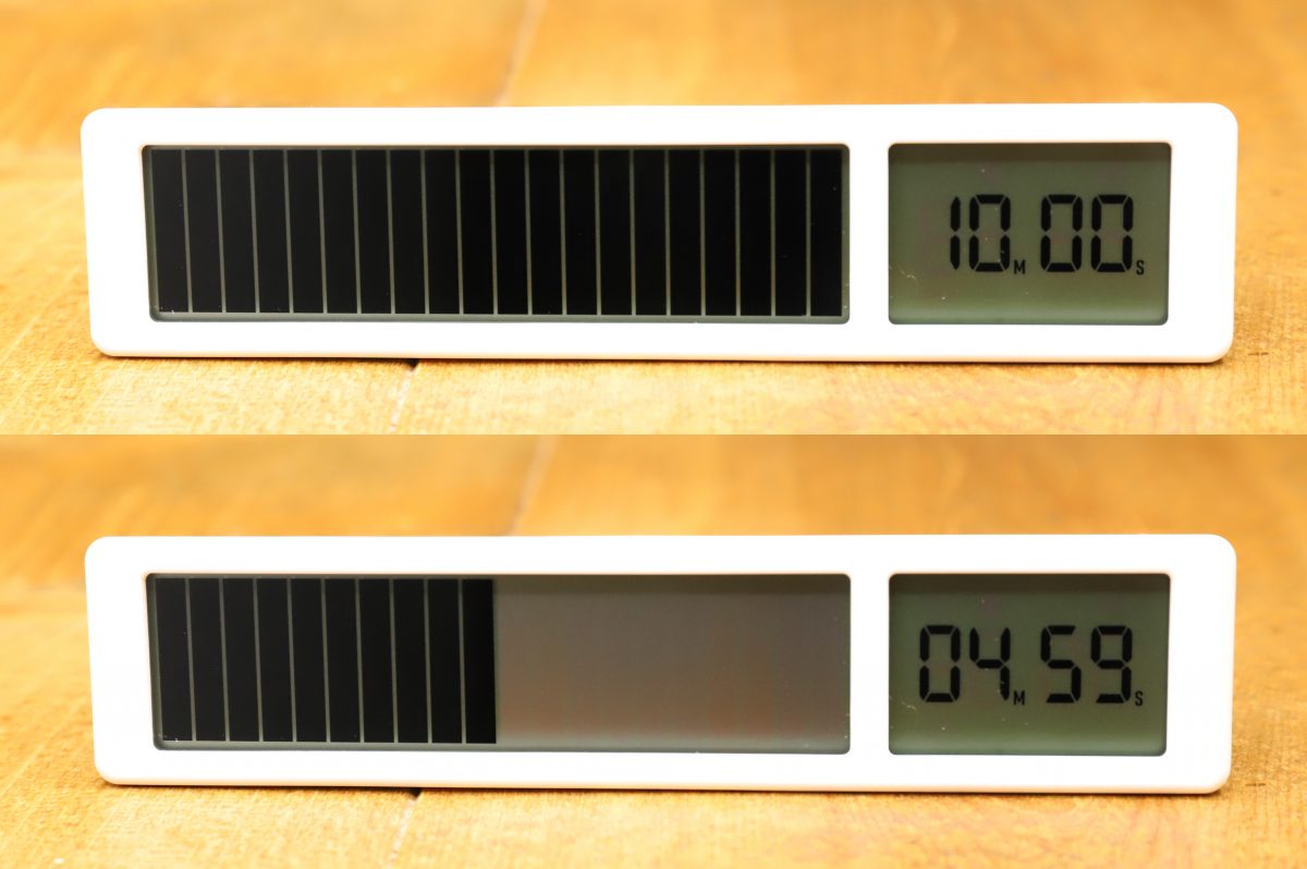 まず、「残り時間の可視化」だが、これはタイマーの時間経過をデジタルの数字だけでなく、パッと見ただけで直感的に把握できる要素で知らせるというもの。アナログ時計型のタイマーなら、針の位置で残り時間を感覚として捉えられるが、デジタルタイマーは数字のカウントダウンだけなので、そこが少々難しい。残り時間「45:00」と表示されていたとして、それが1時間での残り45分なのか、5時間での残り45分なのかで、その重要度は大きく変わってくるはず。