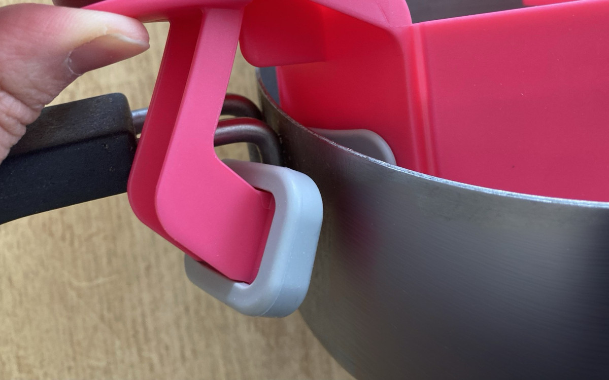 今回はひとまず直径16cmくらいの片手鍋にセットしてみました。鍋の縁に沿わせる感じで大きさを合わせ、挟み込みます。持ち手が大きめなので調理中の熱い鍋にセットするときも安心です。