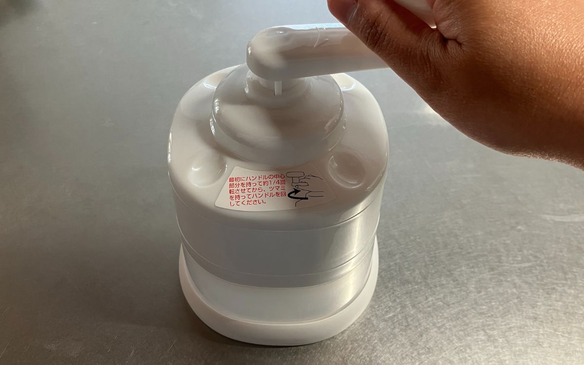 軽い力ですりおろしができる「くるくる大根おろし器」ですが、楽にすりおろすためのコツが。1つは食材を押さえ針にしっかりと押し込んで取り付けること。そしてツマミを回す前に、ハンドルの中心部分を持って約1/4回転させてから回し始めるとスムーズにすりおろすことができます。