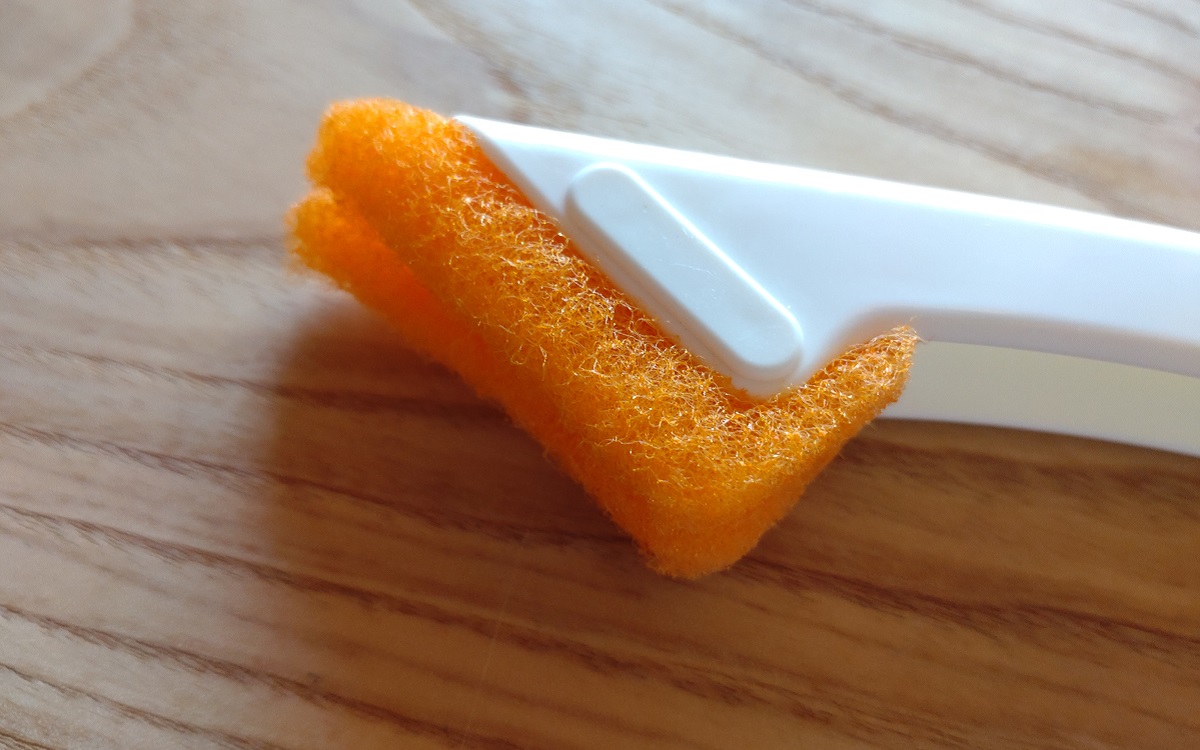 「グリル&トースタークリーナー」ということで、まずはトースターの受け皿を洗ってみました。幅広のスポンジが、受け皿にぴったりフィット。安定感のある接地面で、しっかり汚れを落とせます。角の部分も先端を立てるようにして動かせば、ちゃんと洗えました。