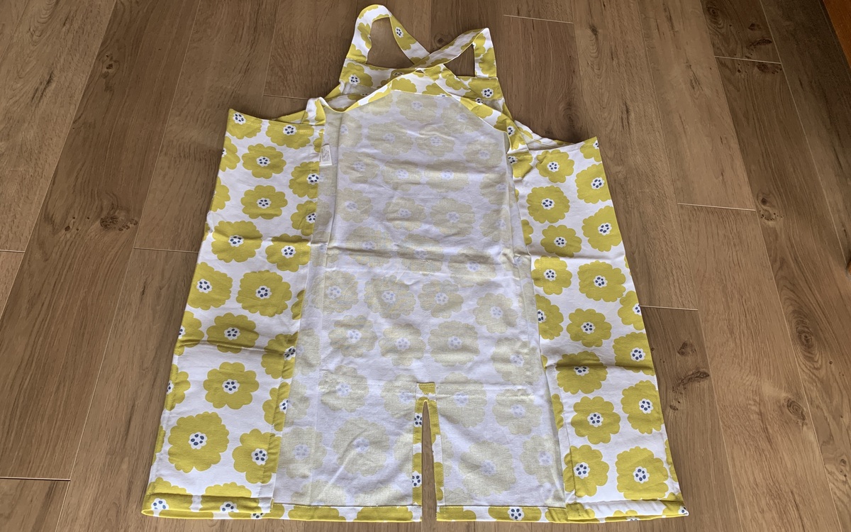 サイズは1サイズで、肩紐を除いた総丈が約73cm。身長163cmの私で裾部分が膝上になる位のサイズ感でした。エプロンには紐やボタンがなく、バサっと被って着るだけなのも簡単でGood! エプロンのお腹部分には真ん中に仕切りの付いた大きめのポケットがついているので、スマホなどのちょっとしたものを入れておけるのも気が利いていますね。