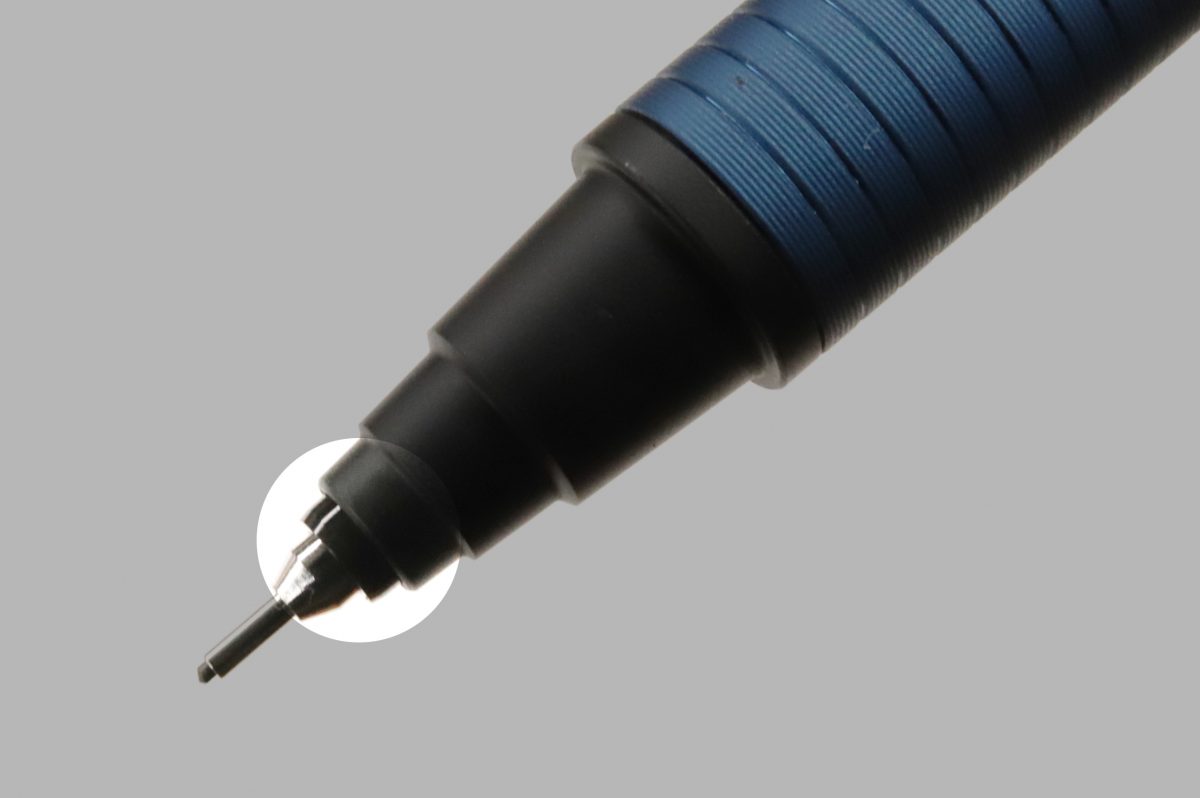 では「メタル」はというと、ブレの抑制具合は「KSモデル」以上で、体感的にはほぼ普通のシャープペンシルといった感じ。ブレによる不快感もほぼ無く、これはかなり驚かされた。機構的に「KSモデル」と同じクルトガエンジンを積んでいるのは間違いないだろうが、それに加えて、口金とペン先の間に挟まれた樹脂製の“ニブダンパー”というパーツが効果を発揮しているらしい。