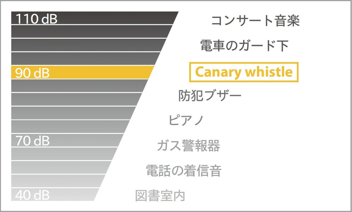 約2m離れた位置で約90dB・4000Hzの音が出ます。防犯ブザーやガス警報器よりも大きな音圧で、人の可聴域20~20000Hzのなかでも小さな音を聞き取りやすいとされている3000~4000Hzの周波数。日常から有事に備え、そっとそばに置いておきたいアイテムです。