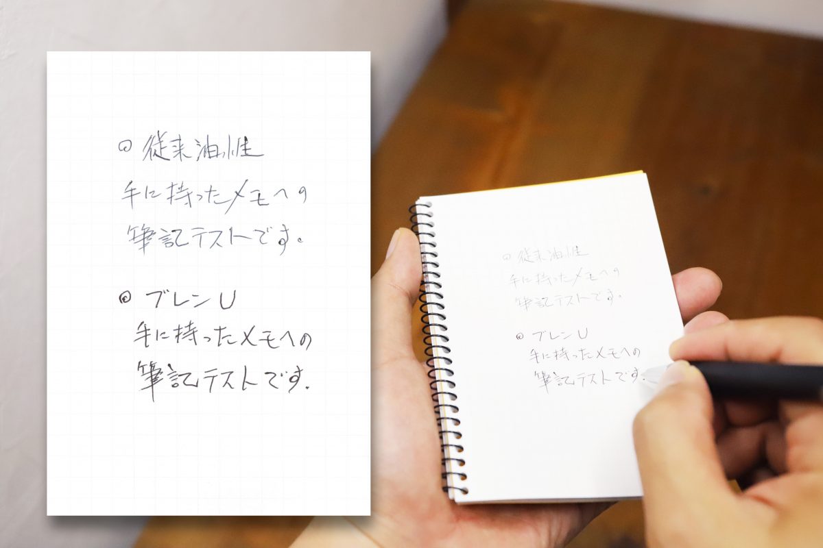 油性ボールペンは、紙の上にペン先のボールを押し付けたまま転がすことでインクを引き出すという仕組み。つまり、手持ちのメモだと紙面がふわふわと安定せず、ボールが転がりにくい。結果としてシンプルに書きづらいということになる。