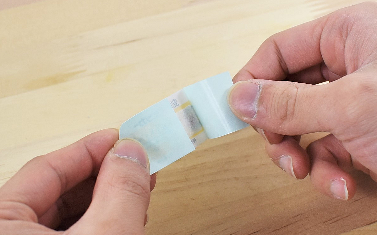 睡眠の深さを記録するには、就寝時にパッチを手のひらに貼っておくことが必要。まず袋からパッチを取り出し、セパレーターを剥がしていきます。貼りつける箇所は、手のひらの親指付近か小指のあたりでもOK。今回私は手のひら中央部分に貼ってみました。