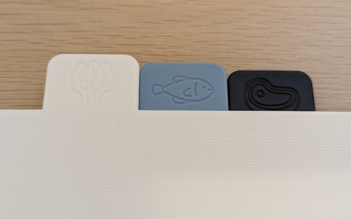 色分けされたまな板に付いているインデックスには、それぞれシンプルなイラストが。ホワイトは野菜や果物、ブルーは魚類、ブラックは肉類と、パッと見て分かるように描かれています。